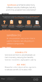 | In what forms are sandboxes made available for review? | There is a recent slight increase in the release of sandbox source code, but generally no implementation artifacts are made available for review. | ‘The state of practice in sandbox validation’ |